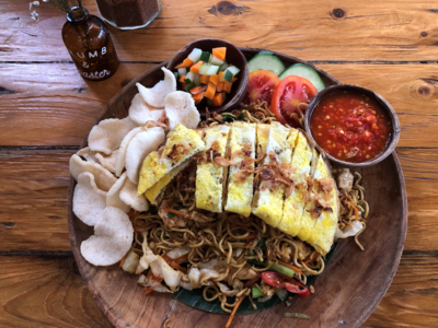 ミーゴレンという食べ物だそうです。ざっくり言うとナシゴレンの麺版!